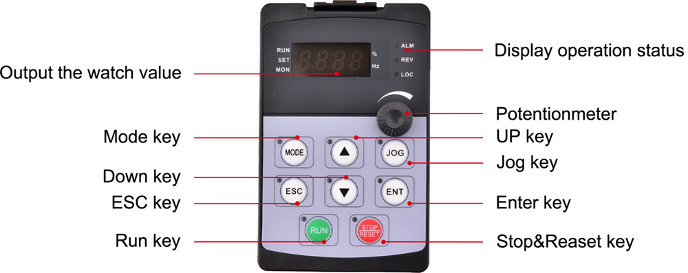 | Сигнал установки частоты | Встроенная панель управления | Мембранный переключатель (кнопка), ручка скорости (потенциометр) |